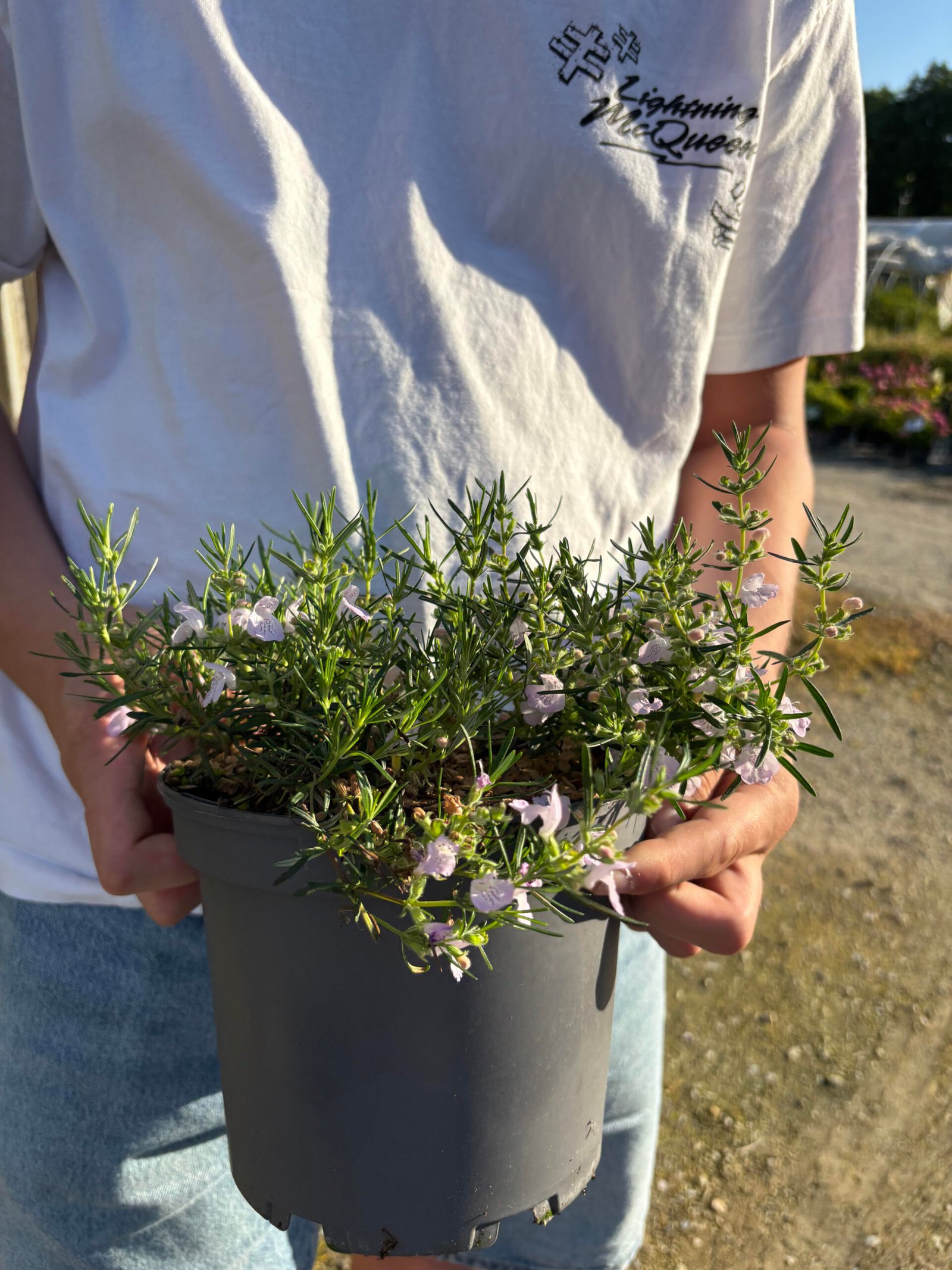 Petit buisson touffu au feuillage odorant en aguilles vertes. Floraison bilabié d’un rose un peu mauve entre février et avril.